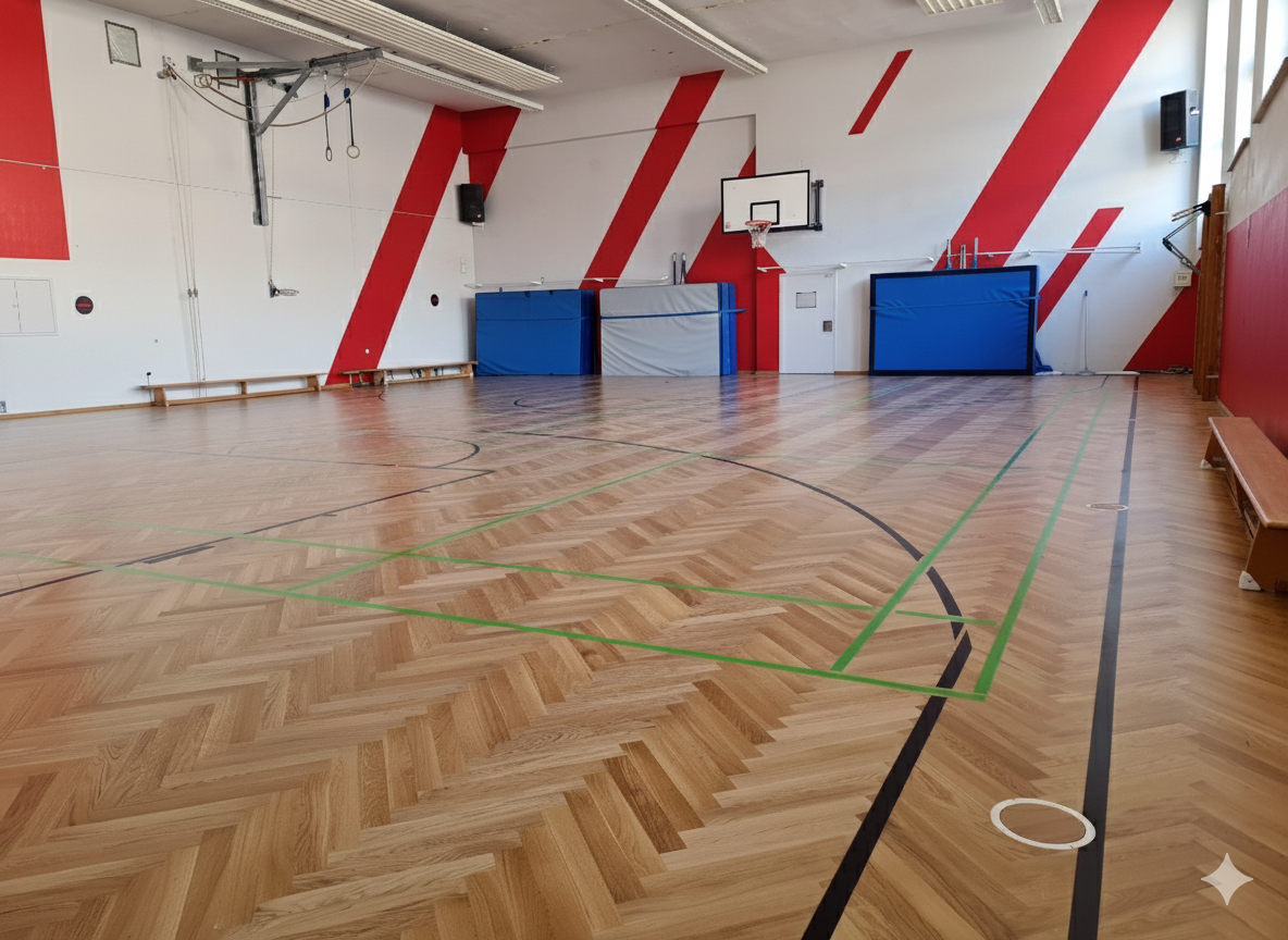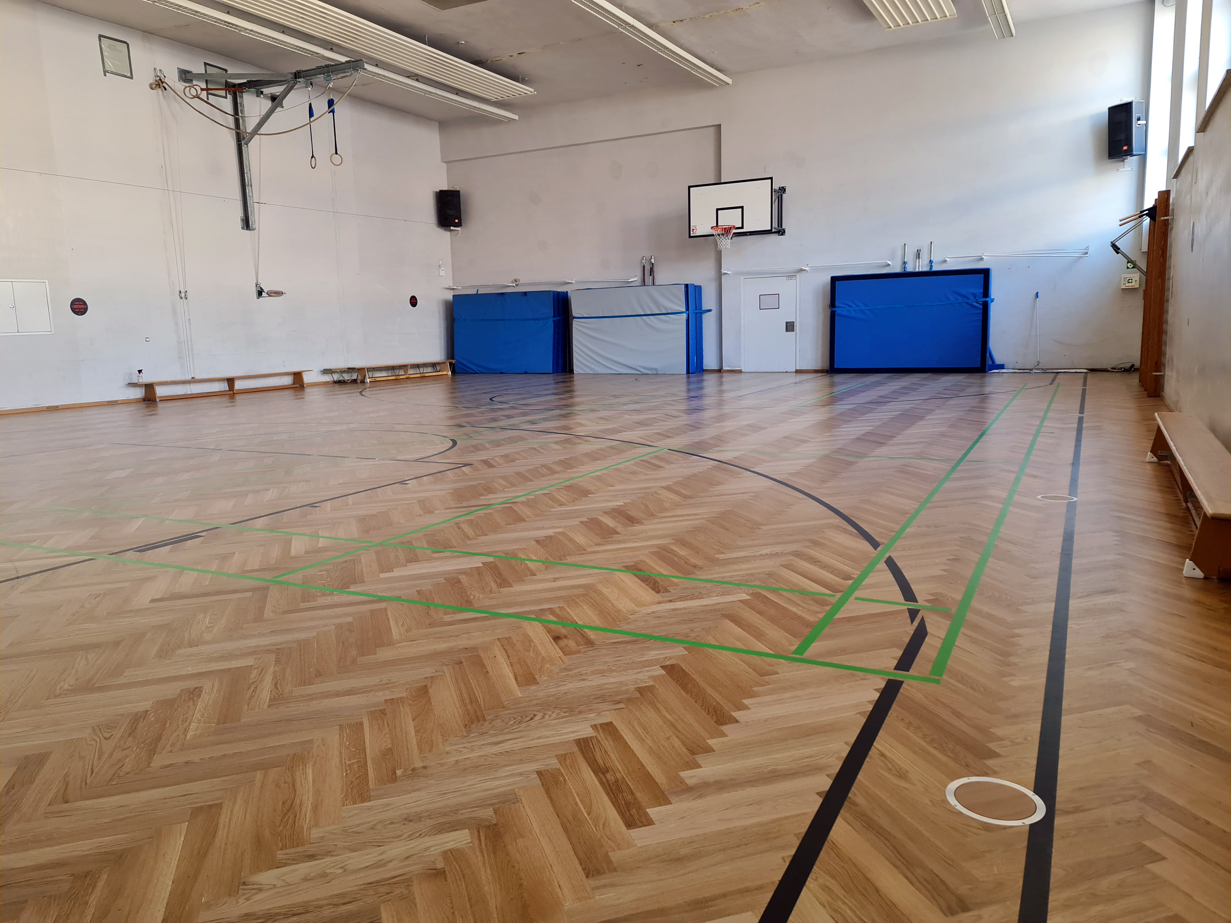 Die Halle wurde 2018 komplet neu gestrichen. Leider hat man bei den umfangreichen Baumaßnahmen im Gebäude erst danach festgetsellt, dass der alte Parketboden mit einem schadstoffhaltigen Kleber verklebt war. Eine aufwändige Schadstoffsanierung war dann leider notwnedig und die Malerarbeiten waren dahin.